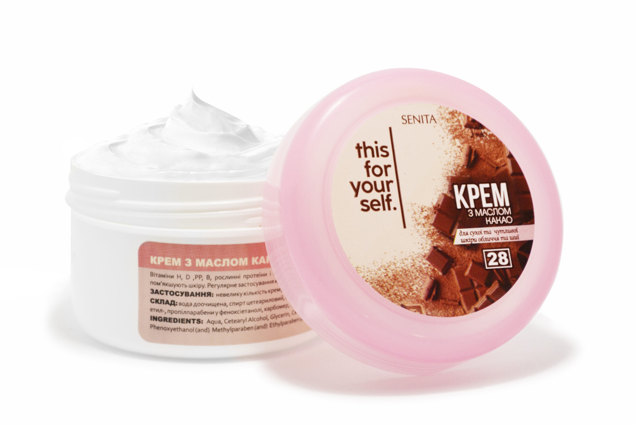 Вітаміни Н, D, РР, В, рослинні протеїни та фітостерини, що містяться в какао, ефективно впливають на епідерміс. Крем зволожує та живить шкіру, надає еластичність та пружність.